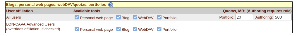 In the domain configuration, I have the boxes checked for "Personal Web Page," "Blog," "WebDAV," and "Portfolio."